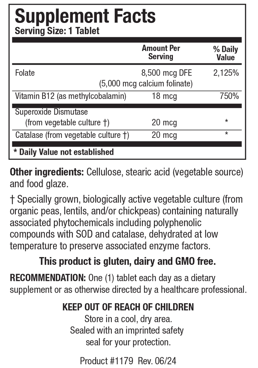 Folate (as calcium folinate), Vitamin B12 (as methylcobalamin), Superoxide Dismutase (from vegetable culture†), Catalase (from vegetable culture†).